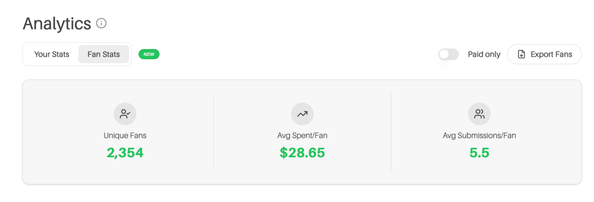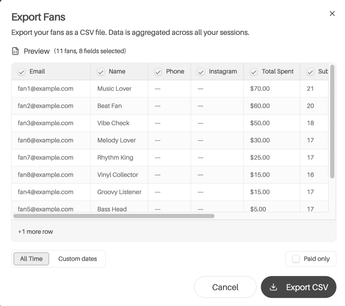 See each fan's total spend, submission count, first and last submission dates, and contact info.